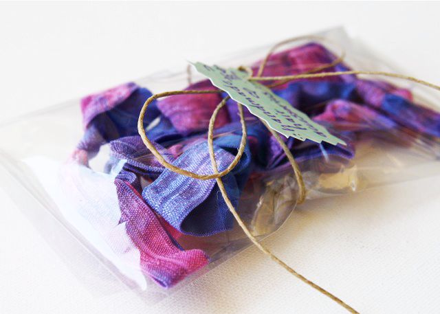 I place the tie dyed elastic in a ziplock overnight for the dye to set in. To dye a few pieces just one color I just added dye directly to the baggies (the left and center baggies):